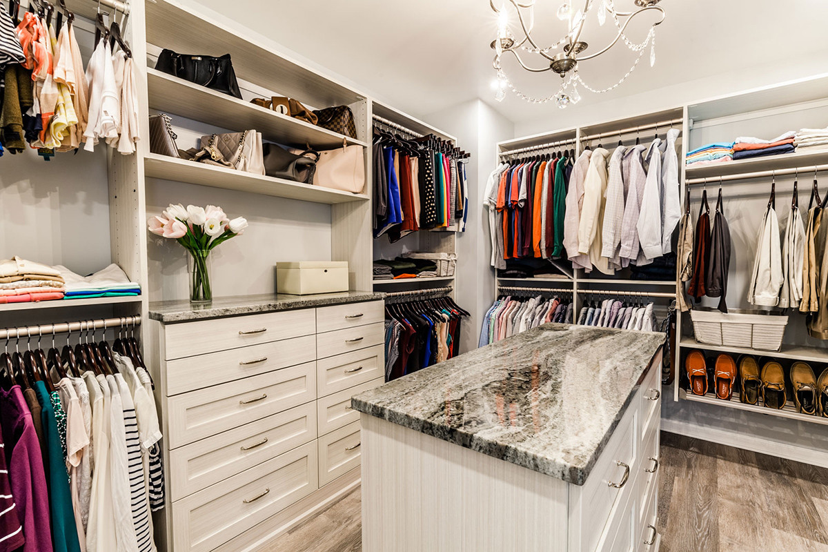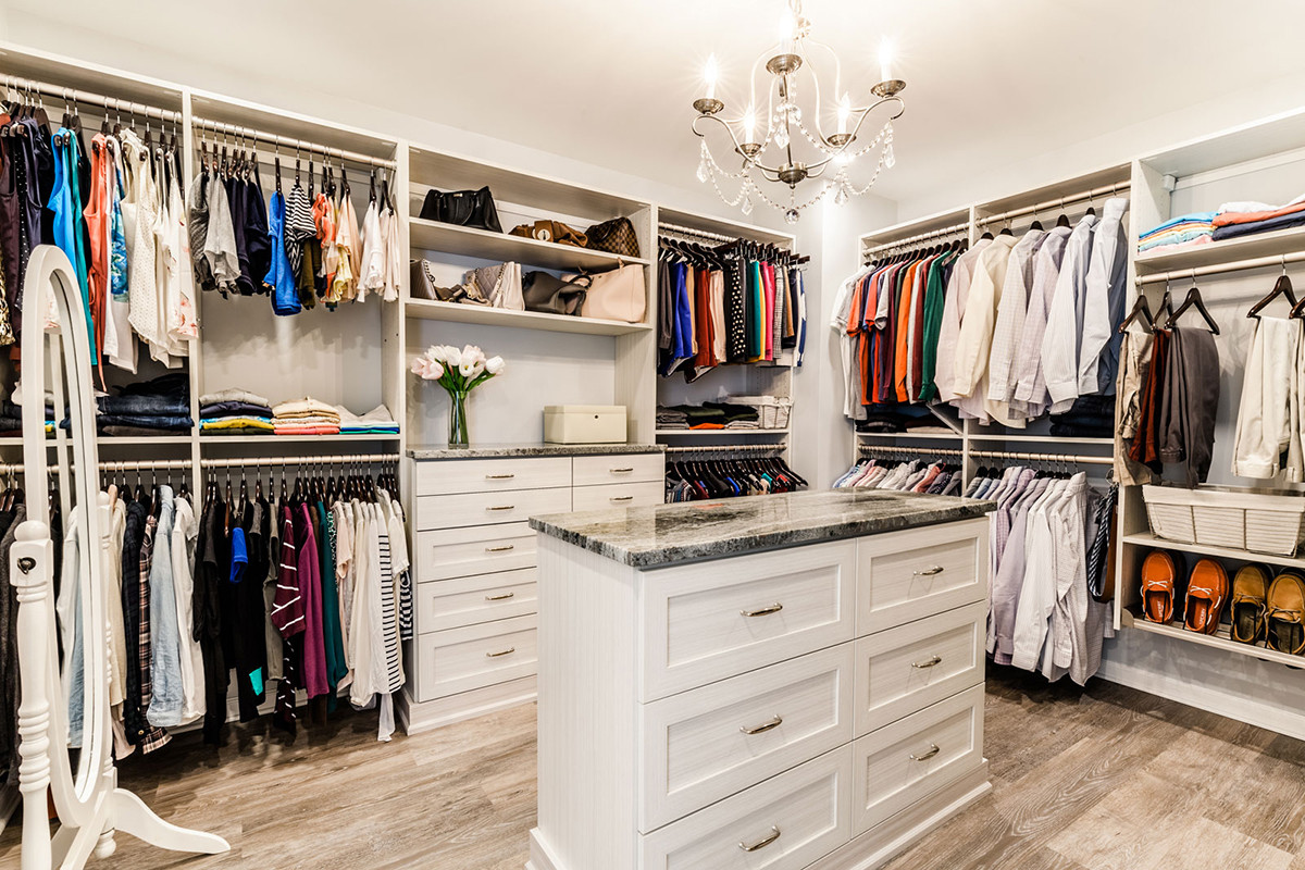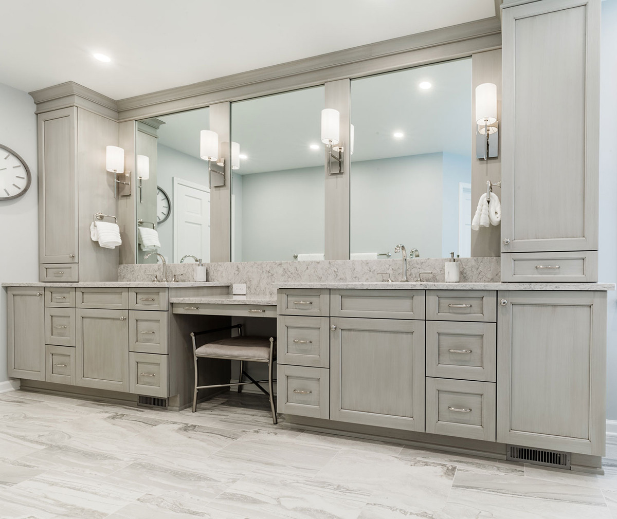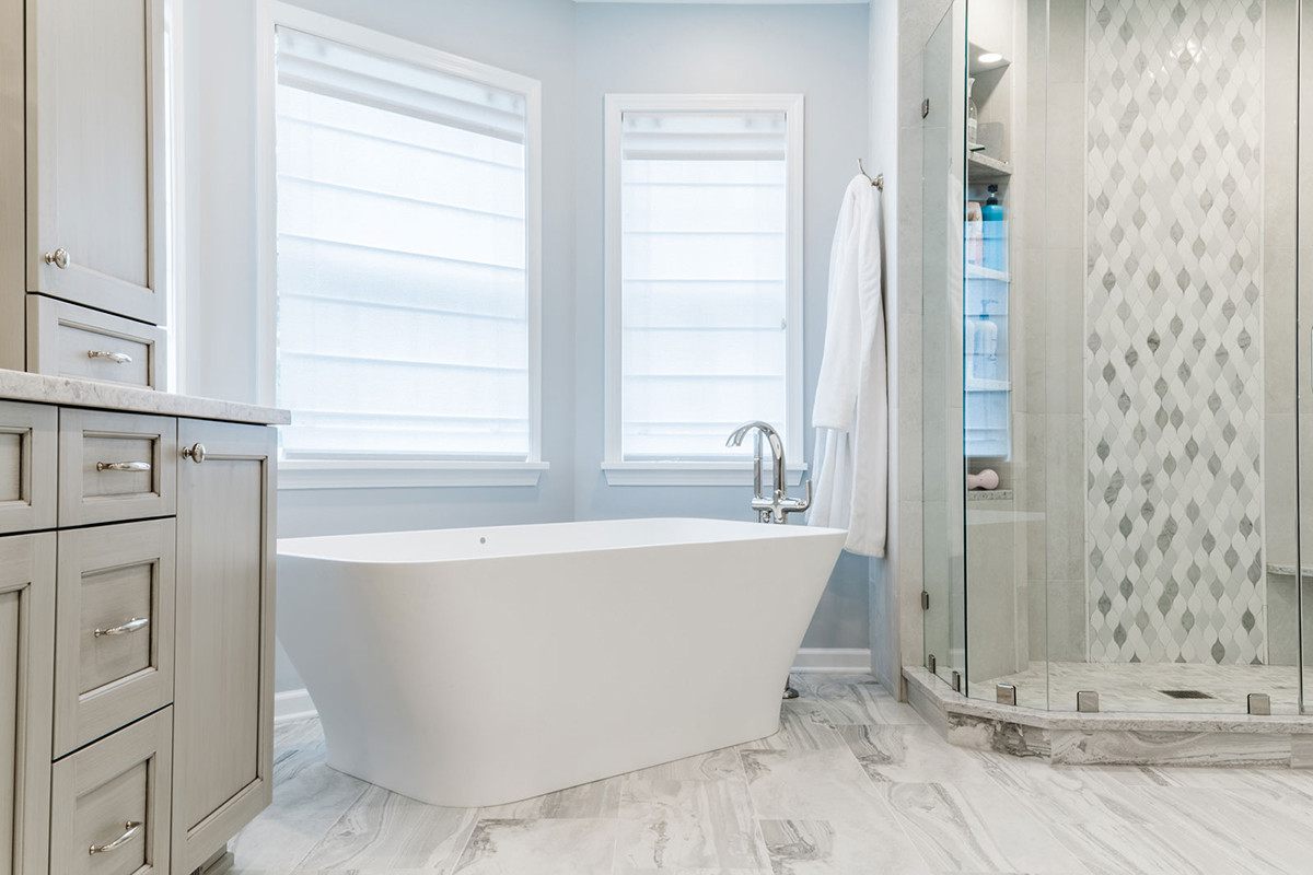 This Concept II designed bathroom is both elegant and minimal. As part of the design, we reclaimed the vestibule in this 1990s built home. Keeping the general location of the bathroom and changing the entry layout allowed for a large bathroom vanity, free standing tub, tiled shower and walk-in closet. The shower was enlarged making it open and bright. Zoned lighting conveniently lights only the areas desired. The cabinetry is traditional in a vintage finish. Encore hand-made ceramic tile is featured as a waterfall in the shower. A cool color palette, modern tub and precise finishings make this a minimal, clean and clutter free retreat.