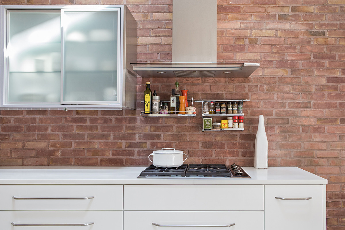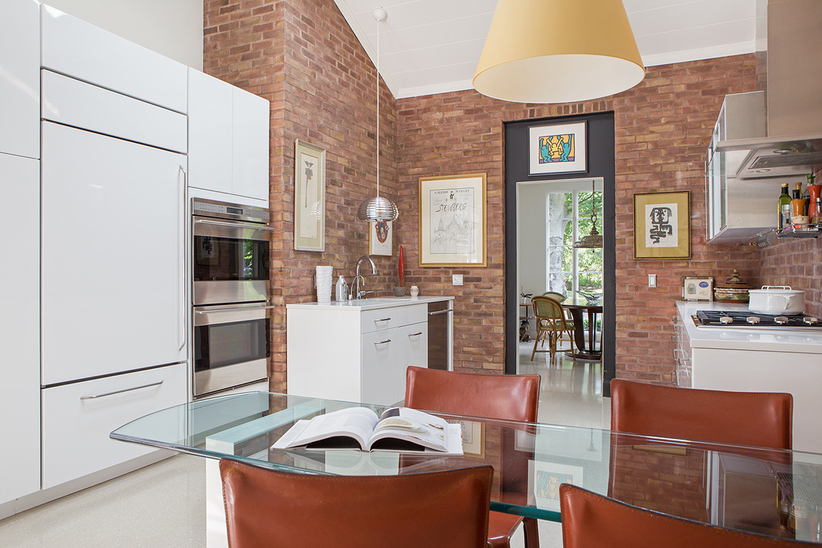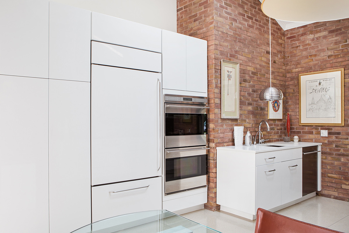 With 18ft high ceilings, hidden doors, angled floor to ceiling bookcases, terrazzo floors, 10ft windows, and a tree growing inside the home; the task was creating a kitchen space to suite. With Concept II, Leslie designed a kitchen as exceptional as this home, allowing the vaulted wood plank ceiling and brick walls to shine. The cabinetry is contemporary frameless in white high gloss finish with a pantry and paneled Sub-Zero. The wall featuring the range is minimalist with a glass range hood and spice racks. The upper cabinetry beautifully houses dishes in stainless steel with frosted glass doors and glass shelves. The complete design is a complement to the modern architecture of the entire home.