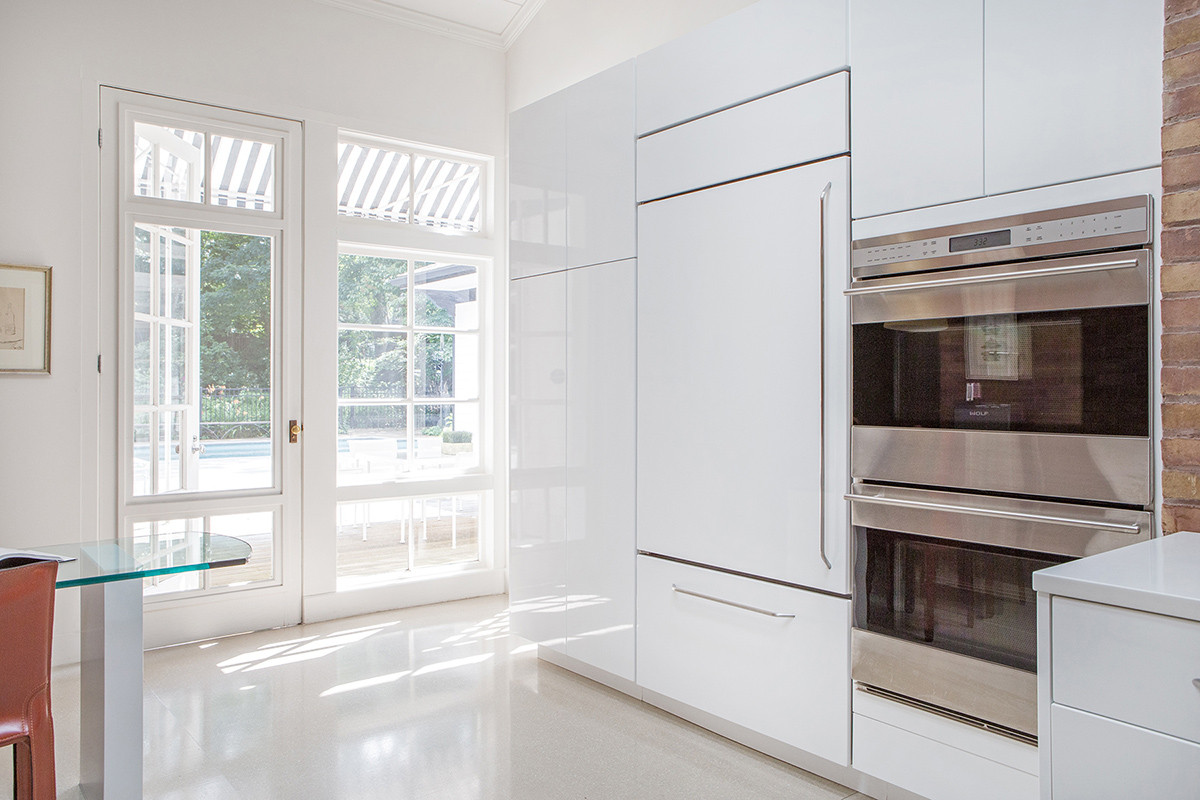 This stunning kitchen was designed in collaboration with Leslie Cordaro of Design Associates. We brought her vision to life with European high gloss slab door custom cabinetry designed to best use the space in this kitchen. The home is such a unique and well-designed by architect, Cyril T. Tucker.