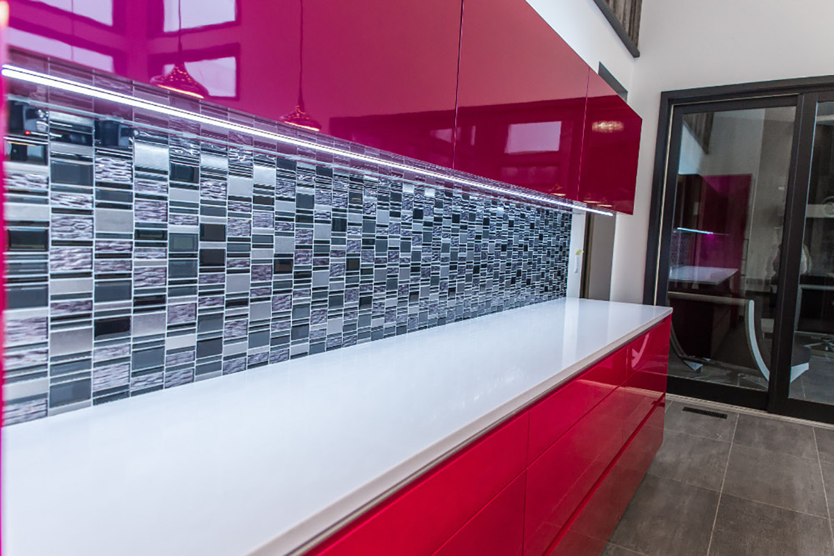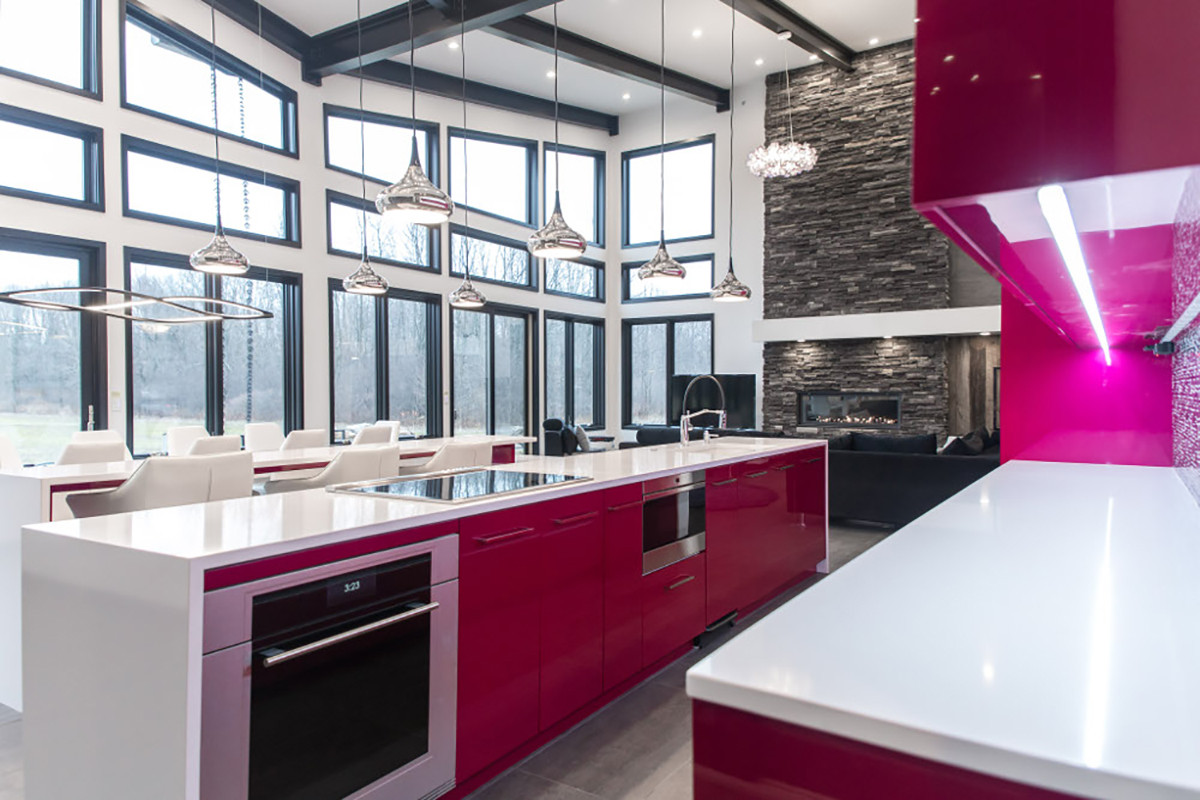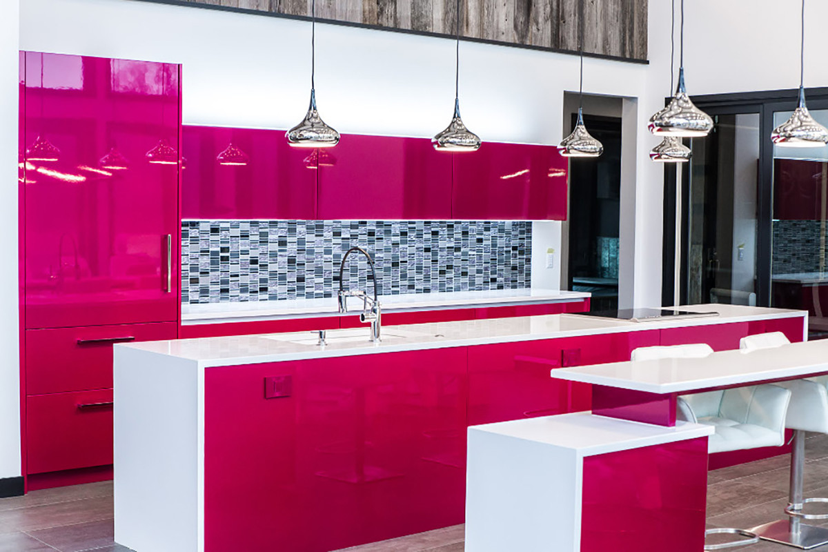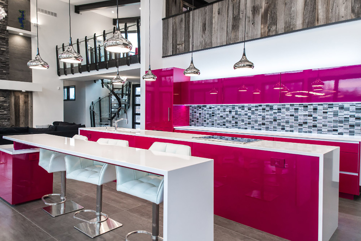 This kitchen remodel was designed for a specific lifestyle and unique aesthetic. Both rustic and modern materials and elements were combined including reclaimed weathered barn wood, powder coated black steel, white high polished quartz countertops from Silestone, and metallic high gloss painted cabinetry from Artcraft.