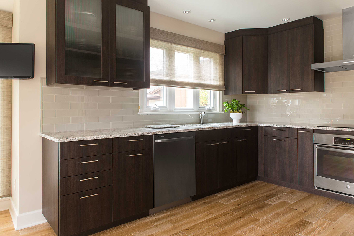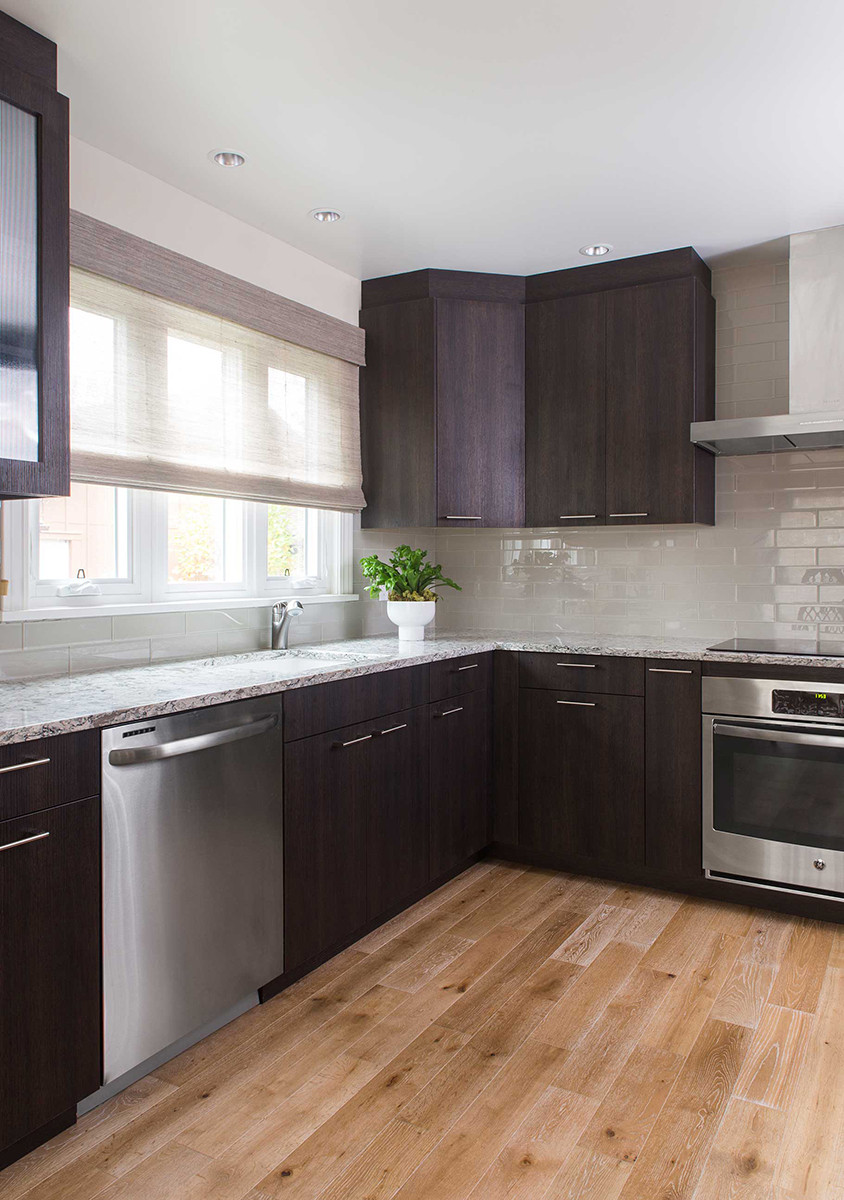 Simplicity is key when it comes to being refined. In this kitchen remodel, these simple and warm contemporary kitchen cabinets are made by Artcraft and define the space's palette. The light Cambria countertops, glass tile backsplash, stainless steel appliances and white washed white oak floors add depth without competing with the cabinetry.